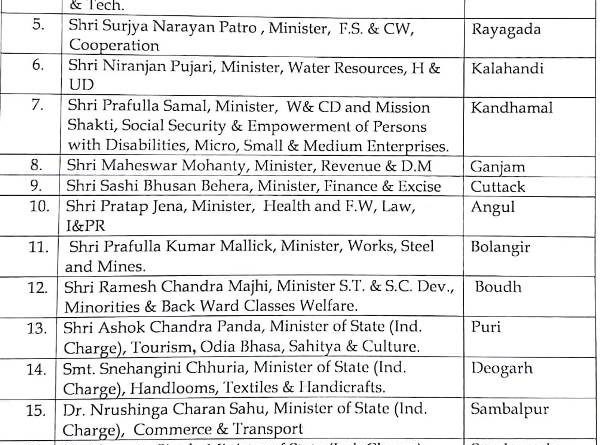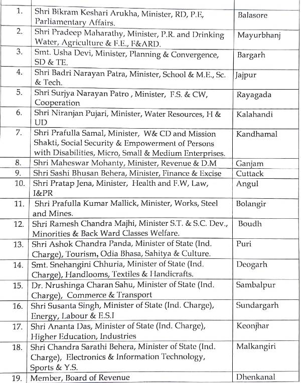 ବାଲେଶ୍ବରରେ ସଂସଦୀୟ ବ୍ୟାପାର ମନ୍ତ୍ରୀ ବିକ୍ରମ କେଶରୀ ଆରୁଖ, ମୟୁରଭଂଜରେ କୃଷି ମନ୍ତ୍ରୀ ମନ୍ତ୍ରୀ ପ୍ରଦୀପ ମହାରଥୀ, ବରଗଡରେ ଯୋଜନା ଓ ସଂଯୋଜନା ମନ୍ତ୍ରୀ ଉଷା ଦେବୀ, ଯାଜପୁରରେ ବିଦ୍ୟାଳୟ ଓ ଗଣଶିକ୍ଷା ମନ୍ତ୍ରୀ ବଦ୍ରିନାରାୟଣ ପାତ୍ର, ରାୟଗଡାରେ ଖାଦ୍ୟ ଯୋଗାଣ ଓ ଖାଉଟି କଲ୍ୟାଣ ମନ୍ତ୍ରୀ ସୂର୍ଯ୍ୟନାରାୟଣ ପାତ୍ର, କଳାହାଣ୍ଡିରେ ଜଳସଂପଦ ମନ୍ତ୍ରୀ ସୂର୍ଯ୍ୟନାରାୟଣ ପାତ୍ର, କନ୍ଧମାଳରେ ମହିଳା ଓ ଶିଶୁ କଲ୍ୟାଣ ମନ୍ତ୍ରୀ ପ୍ରଫୁଲ୍ଲ ସାମଲ, ଗଂଜାମରେ ରାଜସ୍ବ ମନ୍ତ୍ରୀ ମହେଶ୍ବର ମହାନ୍ତି, କଟକରେ ଅର୍ଥ ମନ୍ତ୍ରୀ ଶଶିଭୂଷଣ ବେହେରା, ଅନୁଗୁଳରେ ସ୍ବାସ୍ଥ୍ୟମନ୍ତ୍ରୀ ପ୍ରତାପ ଜେନା, ବଲାଙ୍ଗିରରେ ପୂର୍ତ୍ତମନ୍ତ୍ରୀ ପ୍ରଫୁଲ୍ଲ ମଲ୍ଲିକ, ବୌଦ୍ଧରେ ଅନୁସୂଚିତ ଜାତି ଜନଜାତି ବିକାଶ ମନ୍ତ୍ରୀ ରମେଶ ମାଝୀ, ପୁରୀରେ ପର୍ଯ୍ୟଟନ ଓ ସଂସ୍କୃତି ମନ୍ତ୍ରୀ ଅଶୋକ ଚନ୍ଦ୍ର ପଣ୍ଡା, ଦେବଗଡରେ ବୟନ, ହସ୍ତତନ୍ତ ଓ ହସ୍ତଶିଳ୍ପ ମନ୍ତ୍ରୀ ସ୍ନେହାଙ୍ଗୀନି ଛୁରିଆ, ସମ୍ବଲପୁରରେ ପରିବହନ ମନ୍ତ୍ରୀ ଡାକ୍ତର ନୃସିଂହ ସାହୁ, ସୁନ୍ଦରଗଡରେ ଶକ୍ତିମନ୍ତ୍ରୀ ସୁଶାନ୍ତ ସିଂହ, କେନ୍ଦୁଝରରେ ଉଚ୍ଚଶିକ୍ଷା ମନ୍ତ୍ରୀ ଅନନ୍ତ ଦାସ, ମାଲକାନଗିରି ଜିଲ୍ଲାରେ କ୍ରିଡା ମନ୍ତ୍ରୀ ଚନ୍ଦ୍ରସାରଥୀ ବେହେରା ଜାତୀୟ ପତାକା ଉତ୍ତୋଳନ କରି ପ୍ୟାରେଡ ଅଭିବାଦନ ଗ୍ରହଣ କରିବେ । ସ୍ବାସ୍ଥ୍ୟଗତ କାରଣରୁ ଜଙ୍ଗଲ ଓ ପରିବେଶମନ୍ତ୍ରୀ ବିଜୟଶ୍ରୀ ପତାକା ଉତ୍ତୋଳନ କରିବେ ନାହିଁ ।