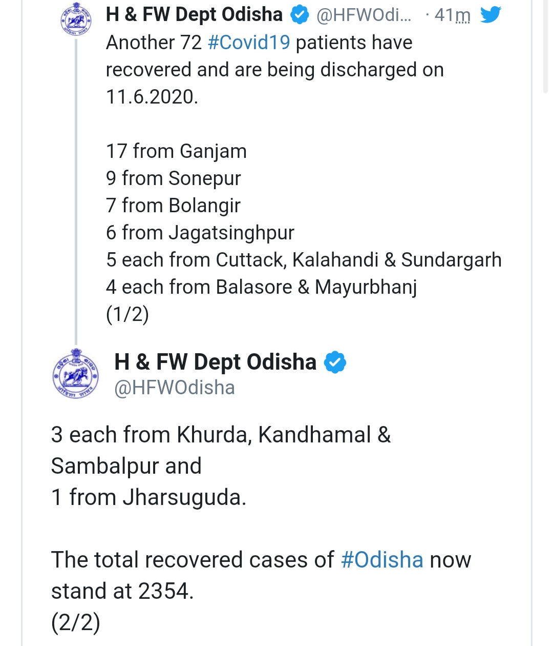 ଭୁବନେଶ୍ୱର() ରାଜ୍ୟରେ ଆଉ ୭୨ କରୋନା ଆକ୍ରାନ୍ତ ସୁସ୍ଥ ହୋଇଛନ୍ତି । ଏହାସହ ଓଡ଼ିଶାରେ ସୁସ୍ଥ ଆକ୍ରାନ୍ତଙ୍କ ସଂଖ୍ୟା ୨୩୫୪କୁ ବୃଦ୍ଧି ପାଇଛି । ସୁସ୍ଥ ହୋଇଥିବା ୭୨ ଆକ୍ରାନ୍ତଙ୍କ ମଧ୍ୟରୁ ଗଞ୍ଜାମରୁ ୧୭, ସୋନପୁରରୁ ୯, ବଲାଙ୍ଗିରରୁ ୭, ଜଗତସିଂହପୁରରୁ ୬, କଟକରୁ ୫, କଳାହାଣ୍ଡିରୁ ୫, ସୁନ୍ଦରଗଡ଼ରୁ ୫, ବାଲେଶ୍ୱରରୁ ୪, ମୟୁରଭଞ୍ଜରୁ ୪, ଖୋର୍ଦ୍ଧା, କନ୍ଧମାଳ ଓ ସମ୍ବଲପୁରରୁ ୩ଜଣ ଲେଖାଏଁ, ଝାରସୁଗୁଡ଼ା ରୁ ଜଣେ ସୁସ୍ଥ ହୋଇଛନ୍ତି । ଏନେଇ ରାଜ୍ୟ ସ୍ୱାସ୍ଥ୍ୟ ଓ ପରିବାର କଲ୍ୟାଣ ବିଭାଗ ପକ୍ଷରୁ ସୂଚନା ମିଳିଛି ।