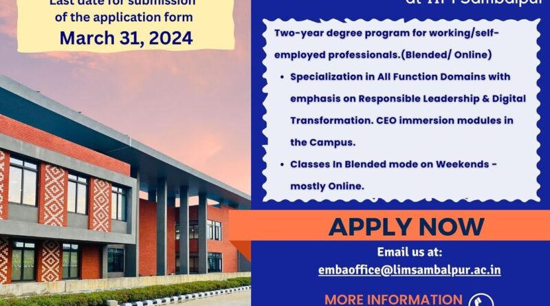Read Moreଆଇଆଇଏମ୍ ସମ୍ବଲପୁର କାମ୍ପସ୍ରେ ଏକ୍ଜିକ୍ୟୁଟିଭ୍ ଏମ୍ବିଏ ପାଇଁ ନାମଲେଖା ଆରମ୍ଭ ଏକ୍ଜିକ୍ୟୁଟିଭ୍ ଏମ୍ବିଏ ପାଇଁ ଆବେଦନର ଶେଷ ତାରିଖ ୨୦୨୪ ମାର୍ଚ୍ଚ ୩୧ ଅଧିକ ବିବରଣୀ ଓ