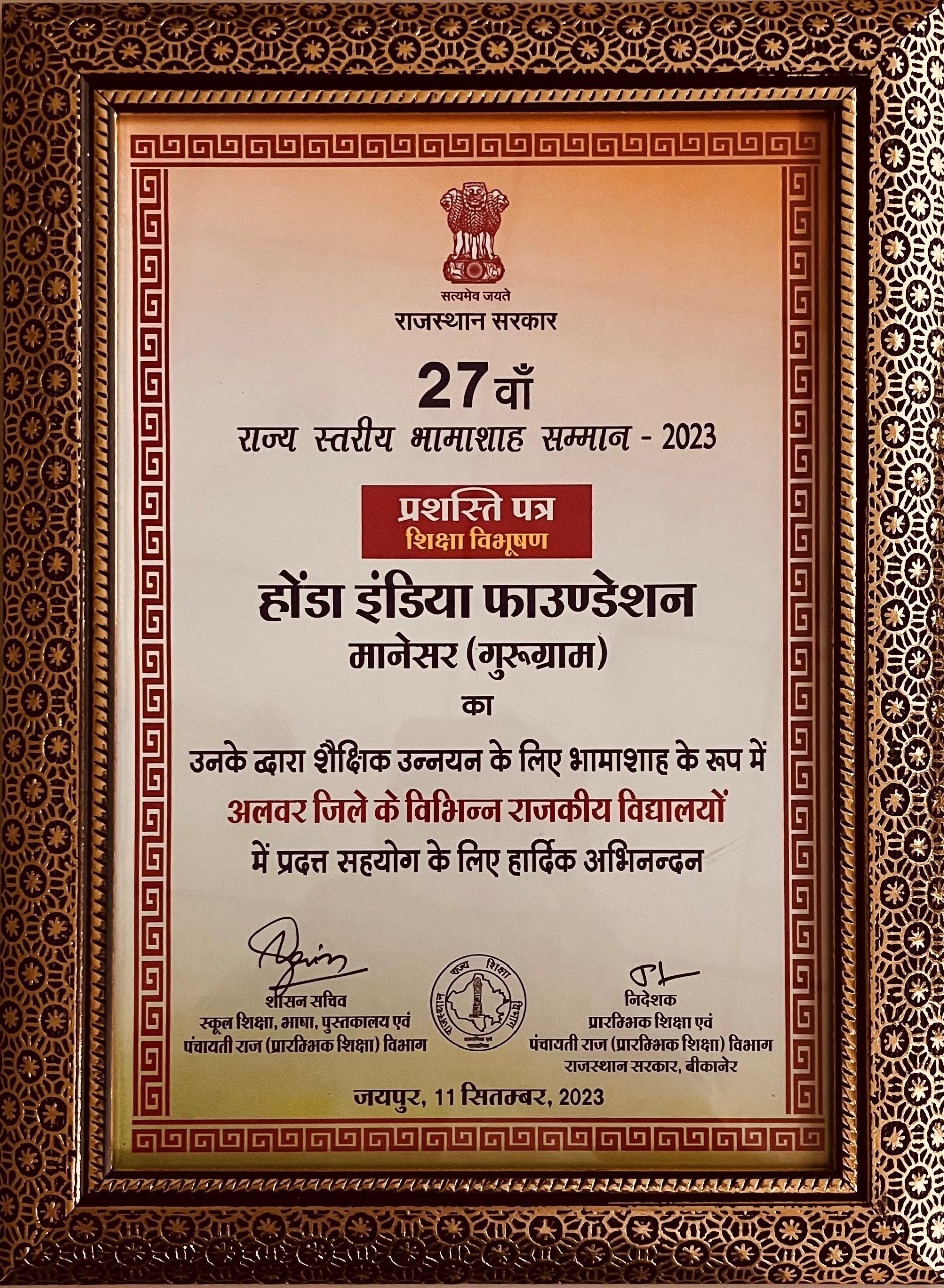 ରାଜସ୍ଥାନର ଶିକ୍ଷା କ୍ଷେତ୍ର ପ୍ରତି ଉଲ୍ଲେଖନୀୟ ଅବଦାନ ପାଇଁ ହୋଣ୍ଡା ଇଣ୍ଡିଆ ଫାଉଣ୍ଡେସନକୁ “ଭମଶାହ ପୁରସ୍କାର’ ପ୍ରଦାନ