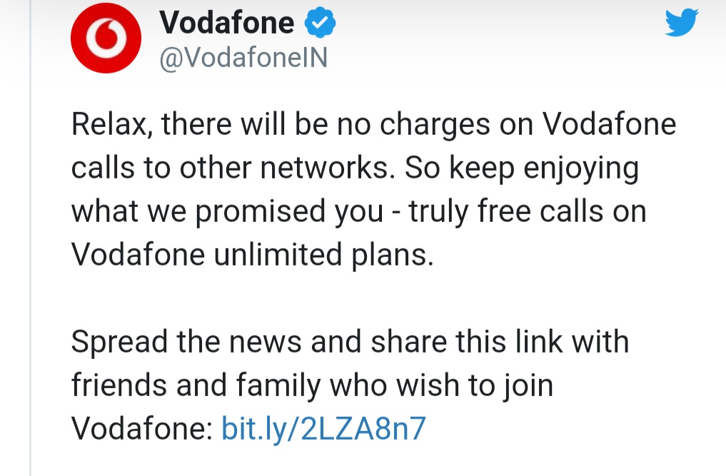 ବୁଧବାର ଜିଓ ଅନ୍ୟ ନେଟ୍ଓ୍ଵାର୍କକୁ କଲ୍ କରିବାକୁ ହେଲେ ଅର୍ଥ ଦେବାକୁ ଘୋଷଣା କରିଥିଲା। ଏହି ଘୋଷଣା ପରେ ଏବେ ଗ୍ରାହକ ଜିଓ ନେଟ୍ଓ୍ଵାର୍କକୁ ଗୁଡ୍ ବାଏ କହିବାକୁ ସଜବାଜ ହେଉଥିବା ବେଳେ ଗ୍ରାହକଙ୍କୁ ଟିକେ ଆଶ୍ୱସ୍ତ କରିଛନ୍ତିି ଭୋଡାଫୋନ୍-ଆଇଡିଆ।