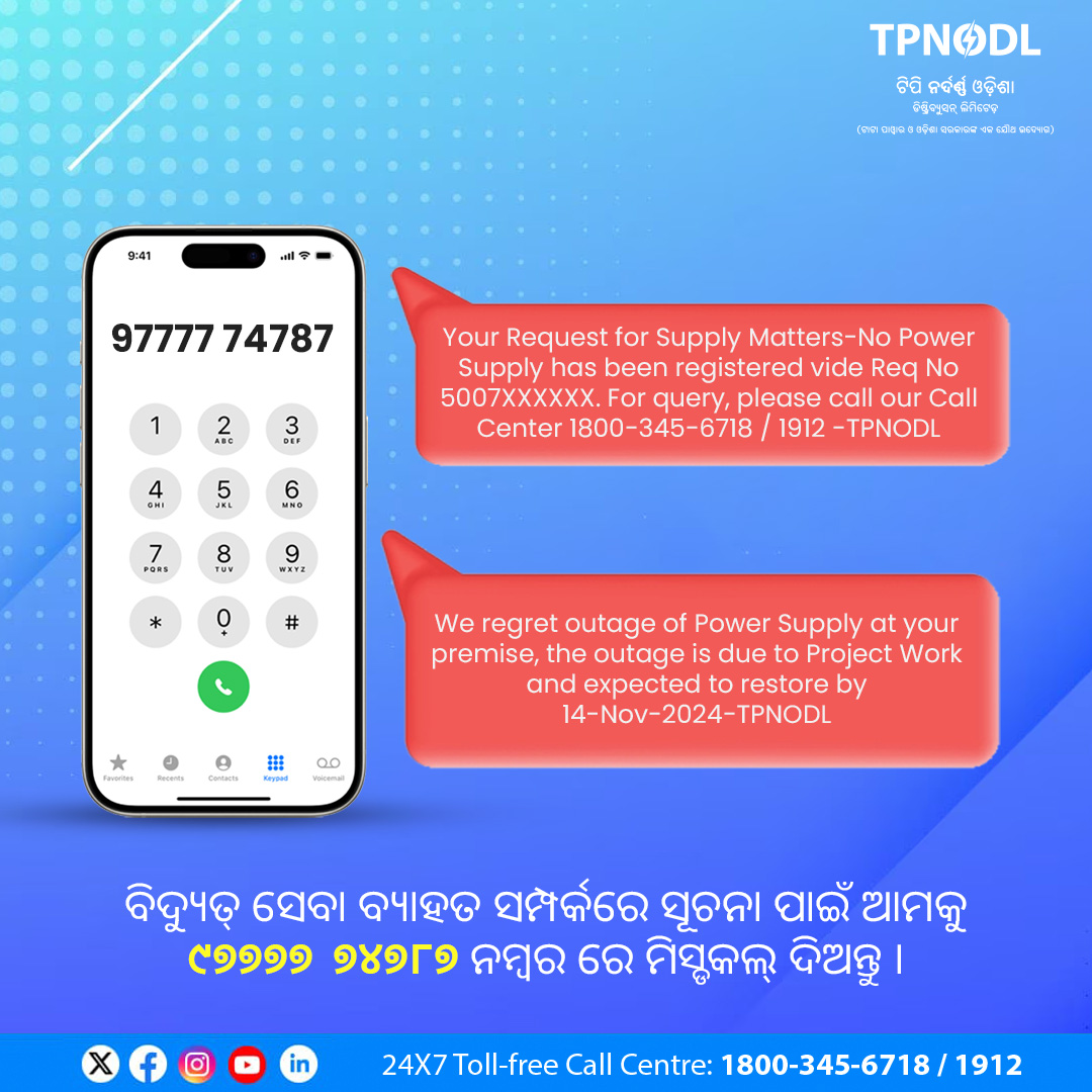 ବିଭିନ୍ନ ଯୋଗାଯୋଗ ଚ୍ୟାନେଲ୍ ମାଧ୍ୟମରେ ନିଜ ଉପସ୍ଥିତିର ସମ୍ପ୍ରସାରଣ କରିବାକୁ ଟିପିଏନ୍ଓଡିଏଲ୍ ପ୍ରତିବଦ୍ଧ ରହିଛି। ଅଧିକ ବିବରଣୀ ଲାଗି ଗ୍ରାହକମାନେ ମାଇଁ ଟାଟା ପାୱାର ଆପ୍ କିମ୍ବା ଦେୟମୁକ୍ତ ନମ୍ବର ୧୯୧୨ ଓ ୧୮୦୦-୩୪୫-୬୭୧୮କୁ ବ୍ୟବହାର କରିପାରିବେ।