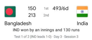 ବିଦର୍ଭ : ତିନି ଦିନ ବି ପୂରିଲା ନାହିଁ । ଏଥିରେ ଭାରତୀୟ ବୋଲର୍ ବାଂଲାଦେଶ ବ୍ୟାଟ୍ସମ୍ୟାନଙ୍କୁ ଧରାଶାୟୀ କରି ଦେଲେ । ଆଉ ଏଠାରେ ଖେଳା ଯାଇଥିବା ପ୍ରଥମ ଟେଷ୍ଟରେ ଭାରତ ଗୋଟିଏ ଇନିଂସ୍ ଓ ୧୩୦ ରନ୍ର ବିପୁଳ ବିଜୟ ହାସଲ କଲା । ମ୍ୟାଚ୍ ଜିତି ଦୁଇ ଟିକିଆ ଟେଷ୍ଟ ସିରିଜ୍ରେ ଘରୋଇ ଦଳ ୧-୦ରେ ଆଗୁଆ ରହିଛି । ପ୍ରଥମେ ବ୍ୟାଟିଂ କରିଥିବା ବାଂଲାଦେଶକୁ ମାତ୍ର ୧୫୦ ରନ୍ରେ ଅଲଆଉଟ୍ କରିବା ପରେ ଭାରତୀୟ ଦଳ ୬ ଓ୍ଵିକେଟ୍ରେ ୪୯୩ ରନ୍ କରି ପ୍ରଥମ ପାଳି ଘୋଷଣା କରିଥିଲା । ଓପ୍ନର ମୟଙ୍କ ଅଗ୍ରଓ୍ଵାଲ ଦ୍ୱିଶତକ କରିଥିଲେ । ତାଙ୍କ ମ୍ୟାନ୍ ଅଫ୍ ଦି ମ୍ୟାଚ୍ ପୁରସ୍କାର ପ୍ରଦନେ କରାଯାଇଛି ।