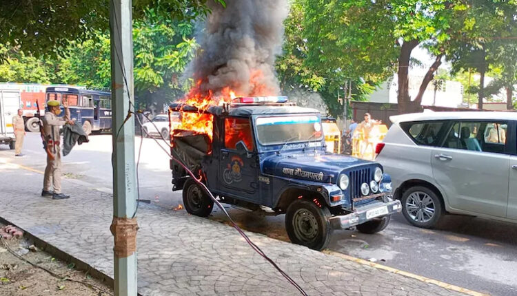 ଅଖିଳେଶ ଯାଦବଙ୍କ ଲକ୍ଷ୍ନୌ ବାସଭବନ ବାହାରେ ପୁଲିସ ଗାଡ଼ିରେ ନିଆଁ ଲଗାଇ ଦେଲେ ପ୍ରତିବାଦକାରୀ