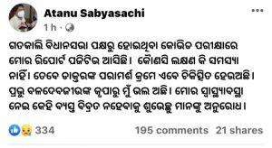 ଏ ନେଇ ସେ ନିଜେ ସୂଚନା ଦେଇ କହିଛନ୍ତି ଯେ, ବିଧାନସଭା ପକ୍ଷରୁ ହୋଇଥିବା କୋଭିଡ଼ ପରୀକ୍ଷାରେ ତାଙ୍କର ରିପୋର୍ଟ ପଜିଟିଭ ଆସିଛି । କୈ।ଣସି ଲକ୍ଷଣ କି ସମସ୍ୟା ନାହି । ଡାକ୍ତରଙ୍କ ପରାମର୍ଶ କ୍ରମେ ଏବେ ଚିକିତ୍ସିତ ହେଉଛି । ପ୍ରଭୁ ବଳଦେବଜୀଙ୍କ କୃପାରୁ ମୁ ଭଲ ଅଛି ବୋଲି ସେ କହିଛନ୍ତି ।