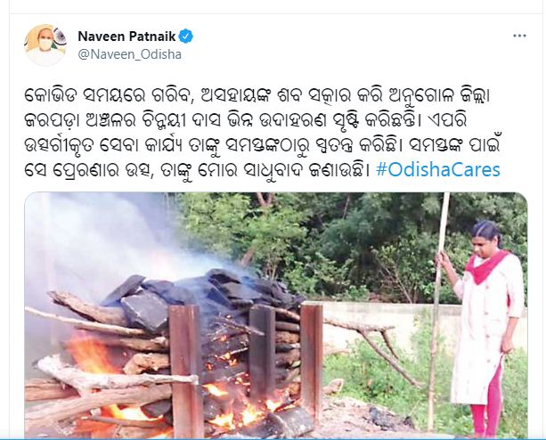ଅନୁଗୁଳ: ଜଣେ କିନ୍ନର ହୋଇ ସମାଜରେ ପାଲଟିଛନ୍ତି ଅନ୍ୟ ମାନଙ୍କ ଲାଗି ଉଦାହରଣ । ଅନୁଗୁଳ ଅଞ୍ଚଳର ଚିନ୍ମୟୀ ଦାସ । ମହାମାରୀ ସମୟରେ ନିଜ ବନ୍ଧୁ ପରିଜନ ଶବକୁ ଛୁଇଁବାକୁ ସାହସ କରୁନଥିବା ବେଳେ ସେ ଶବକୁ ସଂସ୍କାର କରୁଥିବାର ଦୃଶ୍ୟ ଏବେ ସାମନାକୁ ଆସିଛି । ଜଗତସିଂହପୁର ଜିଲ୍ଲାରେ ଜନ୍ମ ଗ୍ରହଣ କରିଥିବା ଗଗନ ବିହାରୀ ଦାସ ପରବର୍ତ୍ତୀ ସମୟରେ ଚିନ୍ମୟୀ ହୋଇଛନ୍ତି । ଯାହାକୁ ନେଇ ପ୍ରଂଶସା କରିଛନ୍ତି ମୁଖ୍ୟମନ୍ତ୍ରୀ ନବୀନ ପଟ୍ଟନାୟକ । ମୁଖ୍ୟମନ୍ତ୍ରୀ ଟ୍ୱିଟର ମାଧ୍ୟମରେ ଚିନ୍ମୟୀଙ୍କୁ ଶୁଭେଚ୍ଛା ଜଣାଇଛନ୍ତି ।