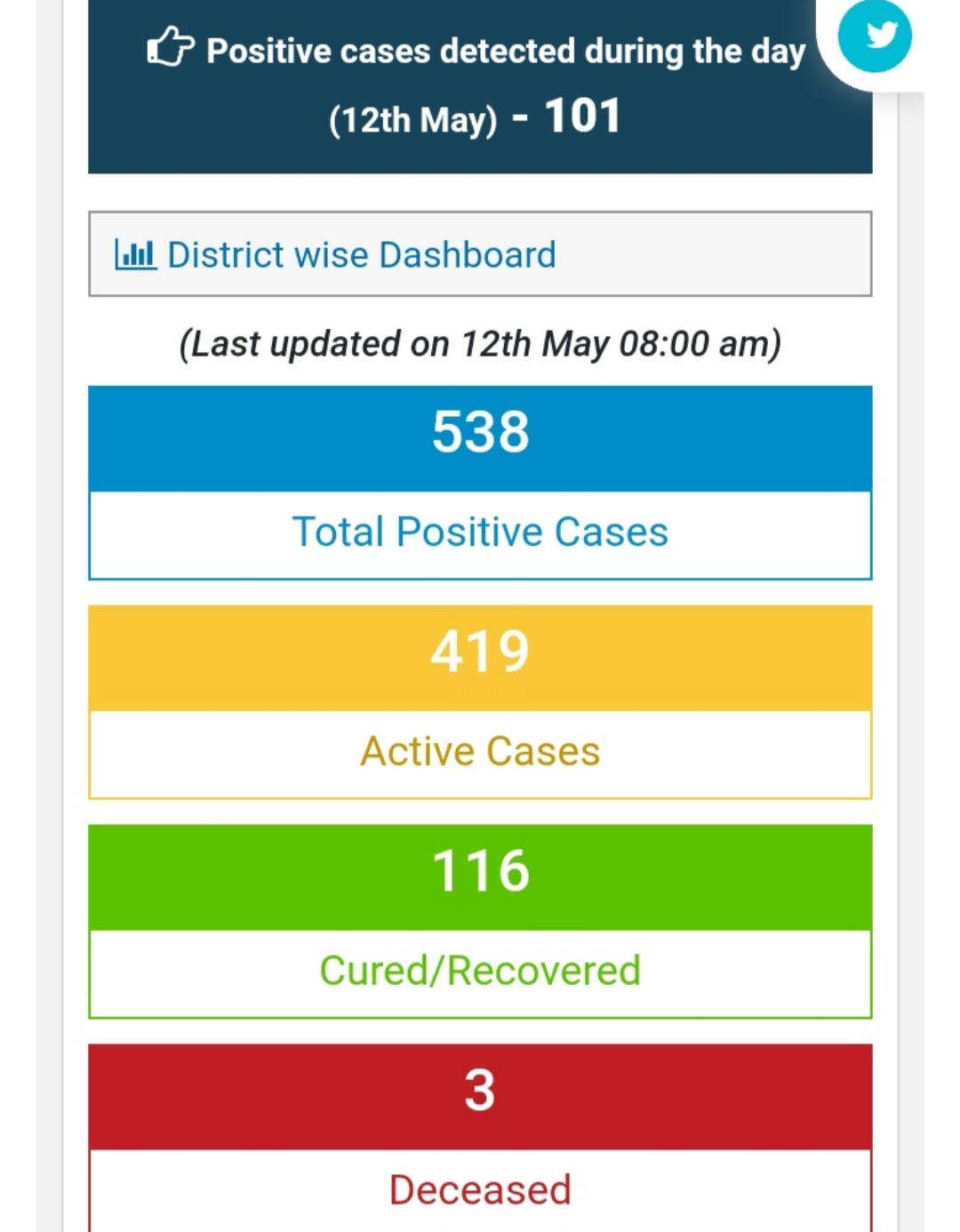 ଉଲ୍ଲେଖଯୋଗ୍ୟ ଯେ ରାଜ୍ୟରେ କରୋନା ଆକ୍ରାନ୍ତଙ୍କ ସଂଖ୍ୟା ୫୩୮ ଥିବା ବେଳେ ସେମାନଙ୍କ ମଧ୍ୟରୁ ୧୧୬ଜଣ ସୁସ୍ଥ ହୋଇଛନ୍ତି ଓ ୩ଜଣଙ୍କର ମୃତ୍ୟୁ ହୋଇଛି । ବତ୍ତର୍ମାନ ଓଡ଼ିଶାରେ କରୋନାରେ ୪୧୬ଜଣ ବିଭିନ୍ନ ହସ୍ପିଟାଲରେ ଚିକିତ୍ସା ହେଉଛନ୍ତି ।