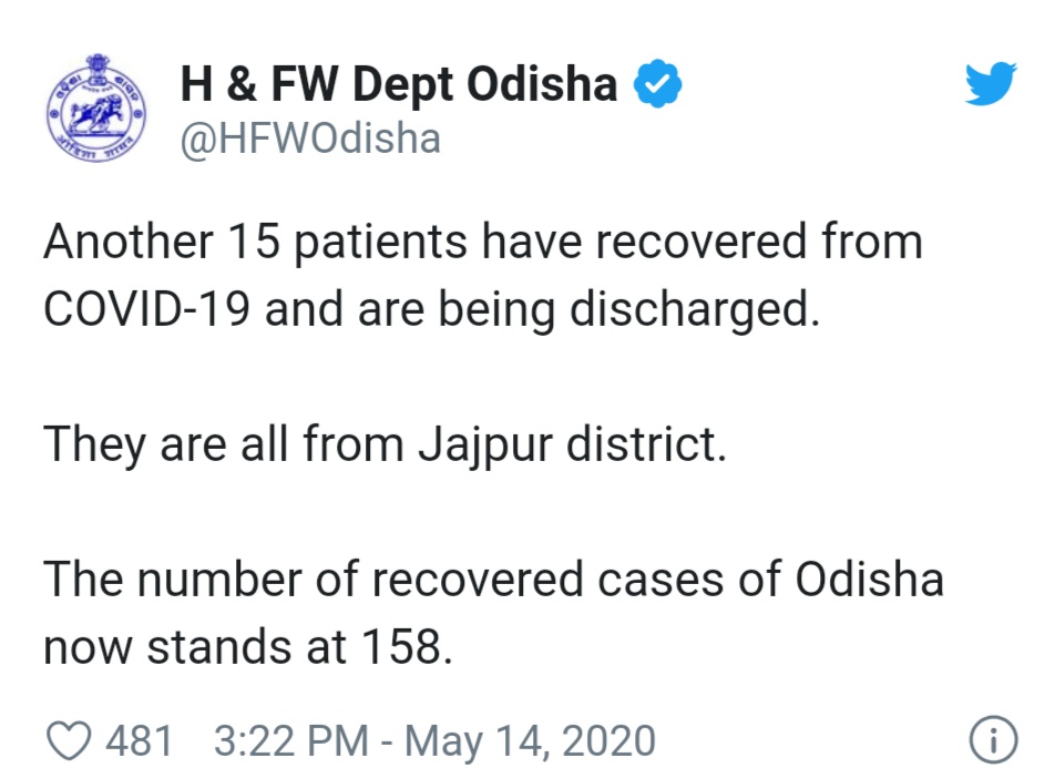 ଉଲ୍ଲେଖଯୋଗ୍ୟ ଯେ ରାଜ୍ୟରେ କରୋନା ଆକ୍ରାନ୍ତଙ୍କ ସଂଖ୍ୟା ୬୨୪ ଥିବା ବେଳେ ସେମାନଙ୍କ ମଧ୍ୟରୁ ୧୫୮ଜଣ ସୁସ୍ଥ ହୋଇଛନ୍ତି ଓ ୩ଜଣଙ୍କର ମୃତ୍ୟୁ ହୋଇଛନ୍ତି । ରାଜ୍ୟରେ ବର୍ତ୍ତମାନ କରୋନାରେ ୪୬୩ ଜଣ ବିଭିନ୍ନ ହସ୍ପିଟାଲରେ ଚିକିତ୍ସିତ ହେଉଛନ୍ତି ।