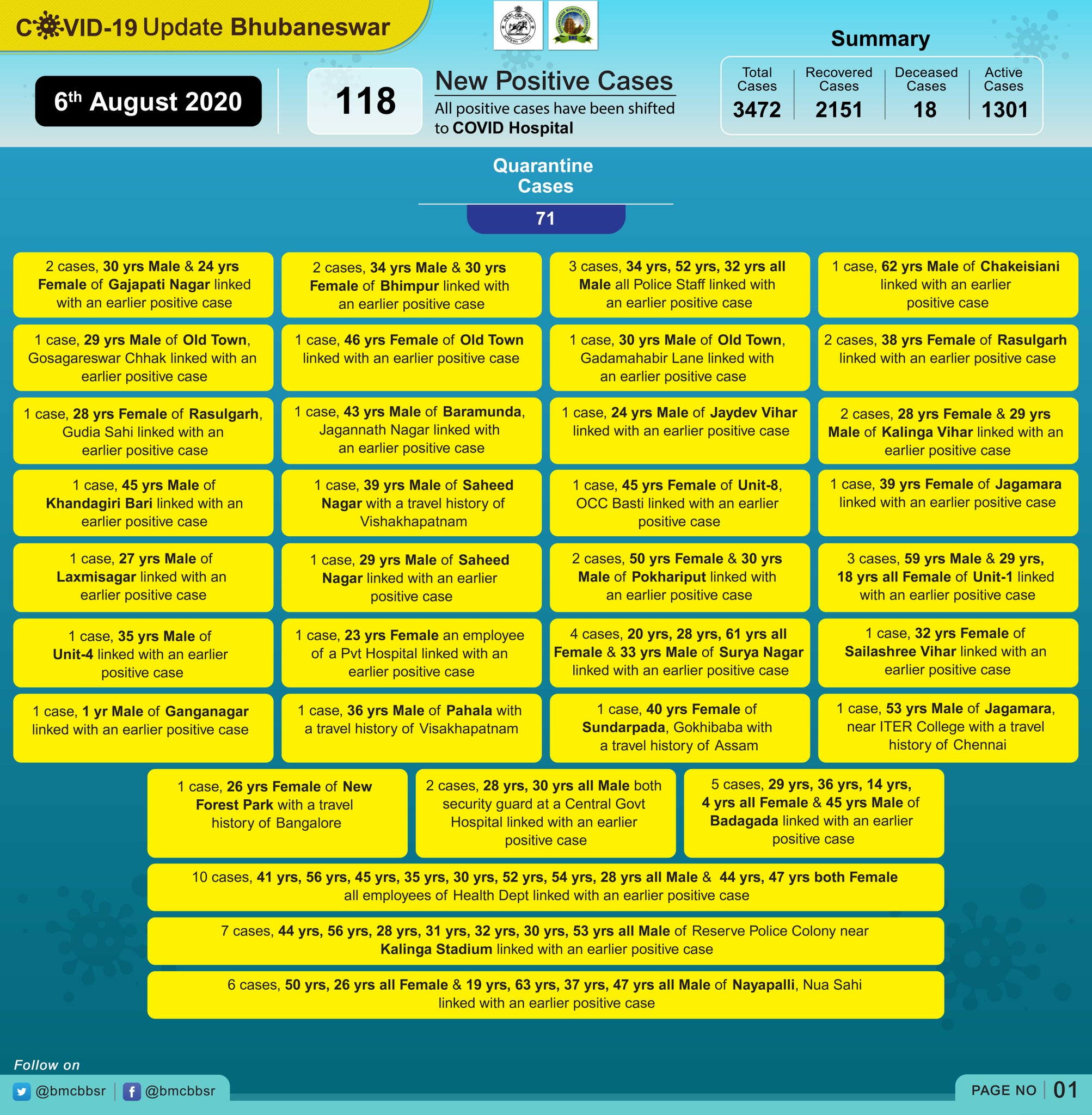 ବର୍ତ୍ତମାନ ସୁଦ୍ଧା ଭୁବନେଶ୍ୱରରୁ ୩୪୭୨ କରୋନା ଆକ୍ରାନ୍ତ ଚିହ୍ନଟ ହୋଇଥିବା ବେଳେ ୨୧୫୧ଜଣ ସୁସ୍ଥ ହୋଇଛନ୍ତି ଓ ୧୮ଜଣଙ୍କର ମୃତ୍ୟୁ ହୋଇଛି । ଏବେ ୧୩୦୧ଜଣ ଚିକିତ୍ସିତ ଅବସ୍ଥାରେ ଅଛନ୍ତି ।