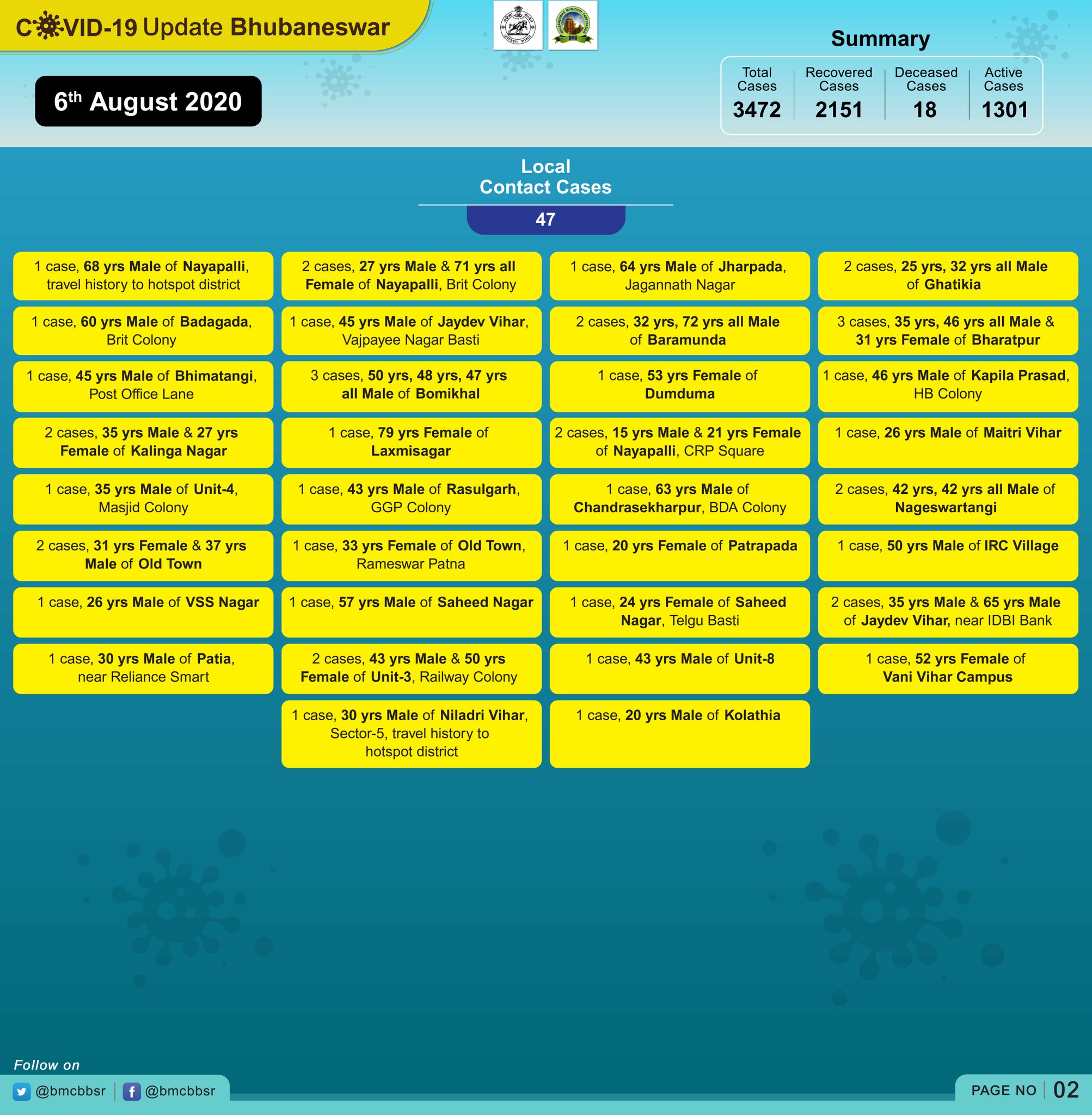 ବର୍ତ୍ତମାନ ସୁଦ୍ଧା ଭୁବନେଶ୍ୱରରୁ ୩୪୭୨ କରୋନା ଆକ୍ରାନ୍ତ ଚିହ୍ନଟ ହୋଇଥିବା ବେଳେ ୨୧୫୧ଜଣ ସୁସ୍ଥ ହୋଇଛନ୍ତି ଓ ୧୮ଜଣଙ୍କର ମୃତ୍ୟୁ ହୋଇଛି । ଏବେ ୧୩୦୧ଜଣ ଚିକିତ୍ସିତ ଅବସ୍ଥାରେ ଅଛନ୍ତି ।