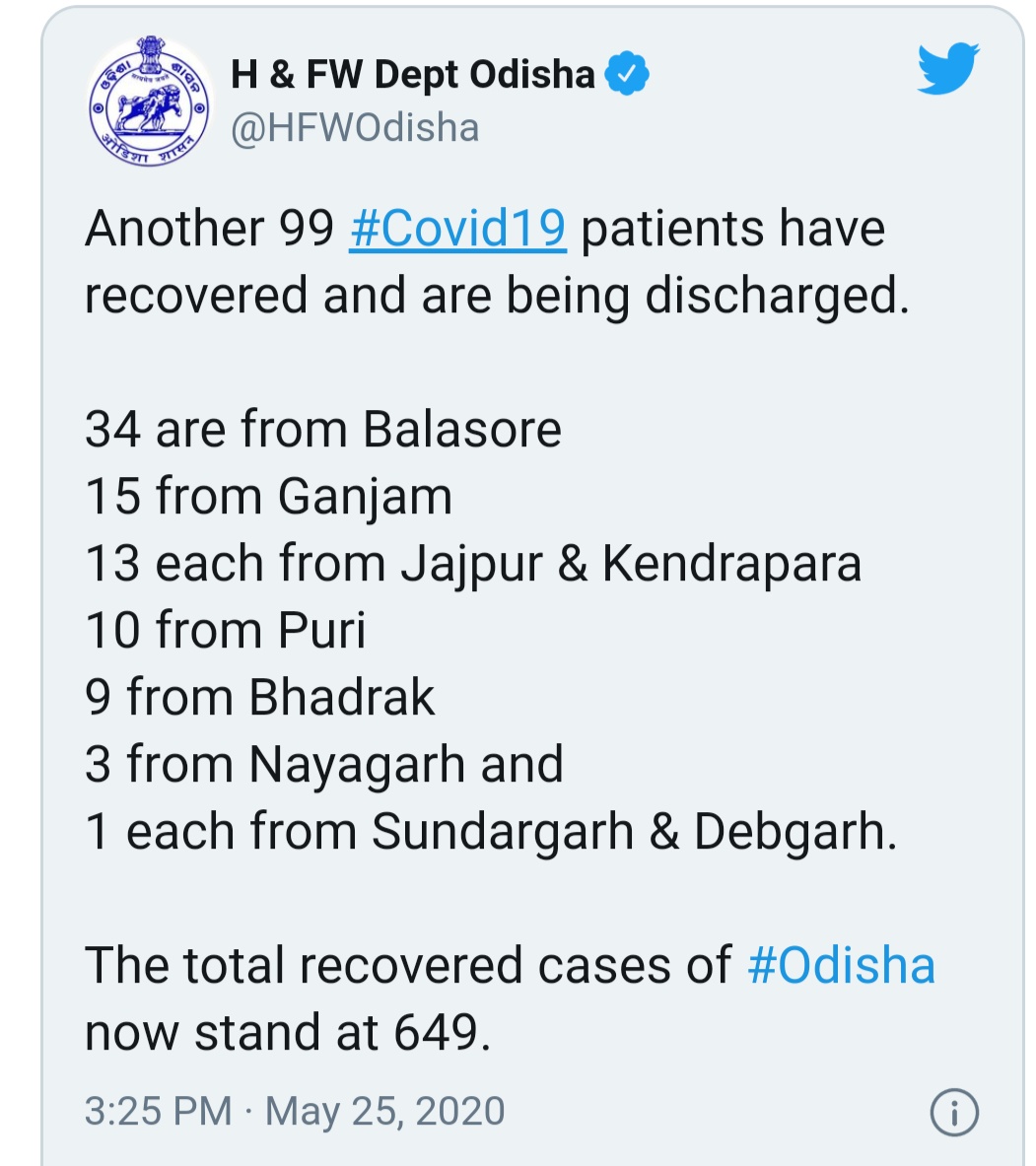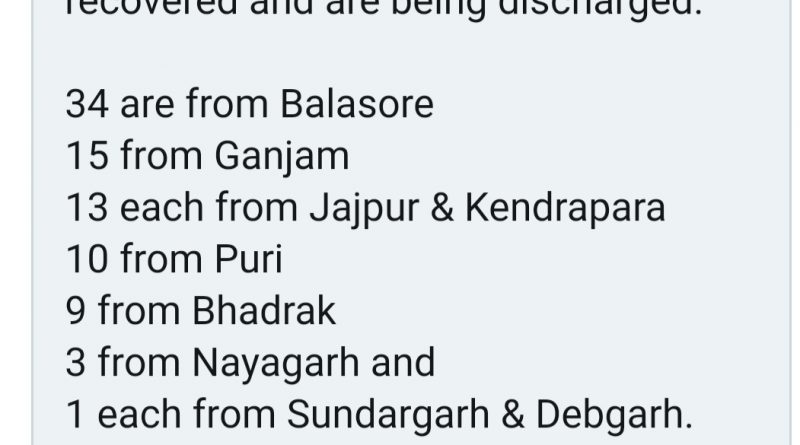 ଭୁବନେଶ୍ୱର() ରାଜ୍ୟରେ ଆଉ ୯୯କରୋନା ଆକ୍ରାନ୍ତ ସୁସ୍ଥ ହୋଇଛନ୍ତି । ଏହାସହ ଓଡ଼ିଶାରେ ସୁସ୍ଥ ଆକ୍ରାନ୍ତଙ୍କ ସଂଖ୍ୟା ୬୪୯କୁ ବୃଦ୍ଧି ପାଇଛି । ସୁସ୍ଥ ହୋଇଥିବା ୯୯ ଆକ୍ରାନ୍ତଙ୍କ ମଧ୍ୟରେ ବାଲେଶ୍ୱରର ସର୍ବାଧିକ ୩୪ଜଣ, ଗଞ୍ଜାମର ୧୫, ଯାଜପୁର ଓ କେନ୍ଦ୍ରାପଡ଼ାର ୧୩, ପୁରୀର ୧୦, ଭଦ୍ରକର ୯, ନୟାଗଡ଼ର ୩ଜଣ, ସୁନ୍ଦରଗଡ଼ ଓ ଦେବଗଡ଼ର ଜଣେ ଲେଖାଏଁ ସୁସ୍ଥ ହୋଇଛନ୍ତି । ଏନେଇ ରାଜ୍ୟ ସ୍ୱାସ୍ଥ୍ୟ ଓ ପରିବାର କଲ୍ୟାଣ ବିଭାଗ ପକ୍ଷରୁ ସୂଚନା ମିଳିଛି ।
