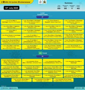 ସ୍ଥାନୀୟ ଅଞ୍ଚଳରୁ ଚିହ୍ନଟ ହୋଇଥିବା ୨୭ଜଣଙ୍କ ମଧ୍ୟରୁ ଜଣେ ବିଜେବି ନଗରରୁ ୨୭ବର୍ଷୀୟ ଯୁବକ, ଜଣେ ଜାଗମରାରୁ ୨୬ବର୍ଷୀୟ ଯୁବକ, ଘଟିକିଆରୁ ଜଣେ ୫୦ବର୍ଷୀୟ ପୁରୁଷ, ଲକ୍ଷ୍ମୀସାଗରରୁ ଜଣେ ୬୨ବର୍ଷୀୟ ବୃଦ୍ଧା, ପୋଖରୀପୁଟରୁ ୬୧ ଓ ୮୪ବର୍ଷୀୟ ଦୁଇ ପୁରୁଷ, ଓଲ୍ଡ ଟାଉନରୁ ଜଣେ ୪୮ବର୍ଷୀୟ ପୁରୁଷ, ଖଣ୍ଡଗିରିରୁ ଜଣେ ୨୩ବର୍ଷୀୟ ଯୁବକ, ଭରତପୁରରୁ ଜଣେ ୫୨ ଓ ୩୦ ବର୍ଷୀୟ ପୁରୁଷ, ରସୁଲଗଡ଼ରୁ ଜଣେ ୩୬ବର୍ଷୀୟ ପୁରୁଷ, ଚନ୍ଦ୍ରଶେଖପୁରରୁ ୩୧ ଓ ୫୭ ବର୍ଷୀୟ ପୁରୁଷ,ବିଶେଶ୍ୱର ବସ୍ତିରୁ ଜଣେ ୪୦ବର୍ଷୀୟ ପୁରୁଷ, ନୟାପଲ୍ଳୀରୁ ଜଣେ ୩୦ବର୍ଷୀୟ ଯୁବକ, ୟୁନିଟ ୪ରୁ ୨୭ବର୍ଷୀୟ ଯୁବକ, ରସୁଲଗଡ଼ରୁ ୧୬ ବର୍ଷୀୟ ଯୁବକ ଓ ୫୦ବର୍ଷୀୟ ବୃଦ୍ଧ, ଖଣ୍ଡଗିରିରୁ ଜଣେ ୬୫ବର୍ଷୀୟ ବୃଦ୍ଧ ଓ ୭ବର୍ଷୀୟ କନ୍ୟା ଶିଶୁ, ମହାବୀର ବସ୍ତିରୁ ଜଣେ ୨୩ବର୍ଷୀୟ ଯୁବକ, କୋଳଥିଆରୁ ୩୦ବର୍ଷୀୟ ମହିଳା, ପାତ୍ରପଡ଼ାରୁ ଜଣେ ୩୮ବର୍ଷୀୟ ପୁରୁଷ, ଖଣ୍ଡଗିରିରୁ ଜଣେ ୩୯ବର୍ଷୀୟ ପୁରୁଷ, ବରମୁଣ୍ଡାରୁ ୨୪ବର୍ଷୀୟ ଓ ୩୫ବର୍ଷୀୟ ମହିଳା, ଘରୋଇ ହସ୍ପିଟାଲରୁ ଜଣେ ୩୦ବର୍ଷୀୟ ମହିଳା ଆକ୍ରାନ୍ତ ଚିହ୍ନଟ ହୋଇଛନ୍ତି ।
