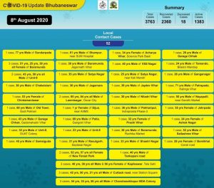 ବର୍ତ୍ତମାନ ସୁଦ୍ଧା ଭୁବନେଶ୍ୱରରୁ ୩୭୬୩ କରୋନା ଆକ୍ରାନ୍ତ ଚିହ୍ନଟ ହୋଇଥିବା ବେଳେ ୨୩୬୦ଜଣ ସୁସ୍ଥ ହୋଇଛନ୍ତି ଓ ୧୮ଜଣଙ୍କର ମୃତ୍ୟୁ ହୋଇଛି । ଏବେ ୧୩୮୩ଜଣ ଚିକିତ୍ସିତ ଅବସ୍ଥାରେ ଅଛନ୍ତି ।