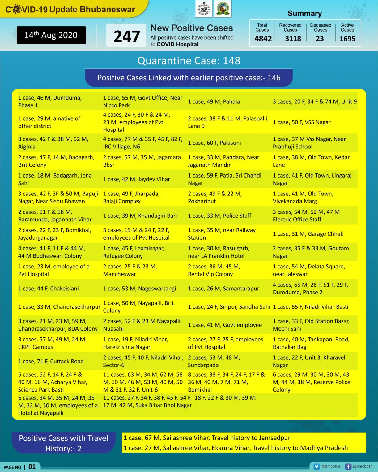 ବର୍ତ୍ତମାନ ସୁଦ୍ଧା ଭୁବନେଶ୍ୱରରୁ ୪୮୪୨ କରୋନା ଆକ୍ରାନ୍ତ ଚିହ୍ନଟ ହୋଇଥିବା ବେଳେ ୩୧୧୮ ଜଣ ସୁସ୍ଥ ହୋଇଛନ୍ତି ଓ ୨୩ ଜଣଙ୍କର ମୃତ୍ୟୁ ହୋଇଛି । ଏବେ ୧୬୯୫ ଜଣ ଚିକିତ୍ସିତ ଅବସ୍ଥାରେ ଅଛନ୍ତି ।