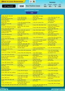 ଭୁବନେଶ୍ୱର() ଆଜି ଭୁବନେଶ୍ୱରରୁ ୩୩୦ କରୋନା ଆକ୍ରାନ୍ତ ଚିହ୍ନଟ ହୋଇଛନ୍ତିି । ଚିହ୍ନଟ ହୋଇଥିବା ୩୩୦ ନୂଆ ଆକ୍ରାନ୍ତଙ୍କ ମଧ୍ୟରୁ ସଙ୍ଗରୋଧ କେନ୍ଦ୍ରରୁ ୧୩୯ ଓ ସ୍ଥାନୀୟ ଅଞ୍ଚଳରୁ ୧୯୧ ଜଣ ଚିହ୍ନଟ ହୋଇଛନ୍ତି । ଏନେଇ ବିଏମସି ପକ୍ଷରୁ ସୂଚନା ମିଳିଛି ।