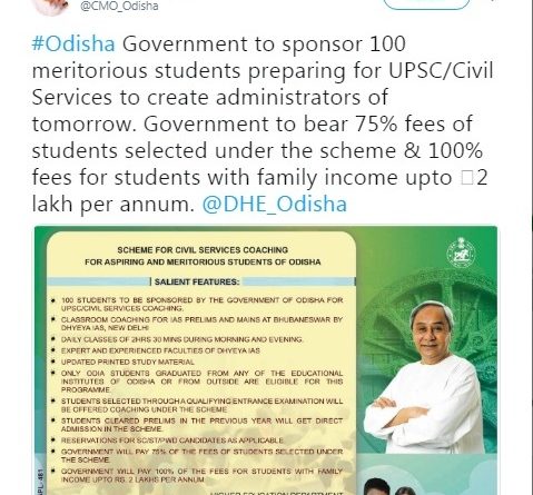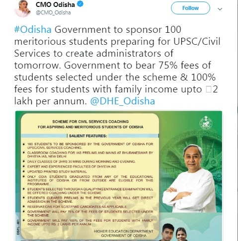 ଭୁବନେଶ୍ବର () ରାଜ୍ୟର ଭଲ ପାଠପଢୁଥିବା ଛାତ୍ରଛାତ୍ରୀଙ୍କ ଭବିଷ୍ୟତ ପାଇଁ ରାଜ୍ୟ ସରକାର ଆଉ ଏକ ଯୋଜନା କରିଛନ୍ତି । ସିଭିଲ ସର୍ଭିସ ପାଇଁ ପ୍ରସ୍ତୁତ ହେଉଥିବା 100 ଜଣ ମେଧାବୀ ଛାତ୍ରଛାତ୍ରୀଙ୍କ ପାଠପଢା ଖର୍ଚ୍ଚ ସରକାର ବହନ କରିବେ । ଆଜି ମୁଖ୍ୟମନ୍ତ୍ରୀ ନବୀନ ପଟ୍ଟନାୟକ ଟ୍ବିଟରରେ ଏହି ଘୋଷଣା କରିଛନ୍ତି ।