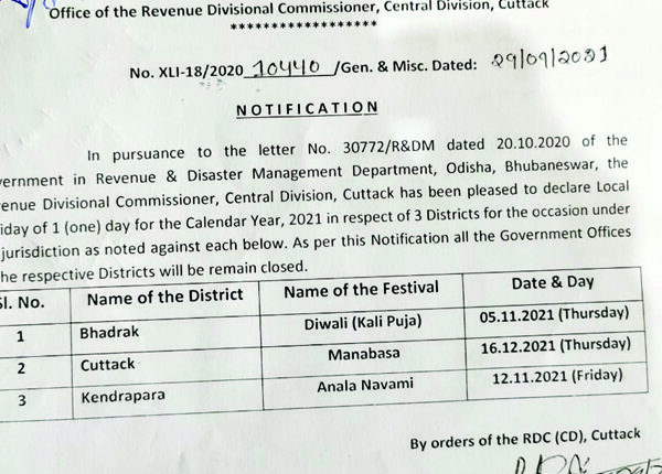 କଟକ: କେନ୍ଦ୍ରାଞ୍ଚଳ ରାଜସ୍ୱ ଆୟୁକ୍ତ ଏହି ରାଜସ୍ୱ ଅଞ୍ଚଳ ମଧ୍ୟରେ ତିନିଟି ଜିଲା ପାଇଁ ଗୋଟିଏ ଲେଖାଏଁ ଦିନକୁ ସ୍ଥାନୀୟ ଛୁଟି ଭାବରେ ଘୋଷଣା କରିଛନ୍ତି । ତଦନୁଯାୟୀ ଭଦ୍ରକ ଜିଲାରେ ଚଳିତ ନଭେମ୍ବର ମାସ ୫ ତାରିଖକୁ କାଳୀପୂଜା ପାଇଁ ସ୍ଥାନୀୟ ଛୁଟି ଦିବସ ଭାବରେ ଘୋଷଣା କରାଯାଇଛି । ସେହିଭଳି କଟକ ଜିଲା ପାଇଁ ଡିସେମ୍ବର ୧୬ ତାରିଖକୁ ମାଣବଷା ପାଇଁ ସ୍ଥାନୀୟ ଛୁଟିଦିବସ ଏବଂ କେନ୍ଦ୍ରାପଡା ଜିଲାରେ ନଭେମ୍ବର ୧୨ ତାରିଖକୁ ଅଁଳା ନବମୀ ପାଇଁ ସ୍ଥାନୀୟ ଛୁଟି ଦିବସ ଭାବରେ ଘୋଷଣା କରାଯାଇଛି । ଏହାଦ୍ୱାରା ନିର୍ଦ୍ଧାରିତ ଛୁଟି ଦିନରେ ସଂପୃକ୍ତ ଜିଲାର ସ୍ଥାନୀୟ ସରକାରୀ କାର୍ଯ୍ୟାଳୟଗୁଡିକ ବନ୍ଦ ରହିବ ।
