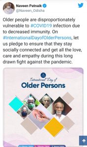 ରୋଗ ପ୍ରତିରୋଧକ ଶକ୍ତି ହ୍ରାସ କାରଣରୁ ବରିଷ୍ଠ ନାଗରିକମାନେ ଅସୁରକ୍ଷିତ ଅଛନ୍ତି । ଏନେଇ ବରିଷ୍ଠ ନାଗରିକଙ୍କ ସୁରକ୍ଷା ସୁନିଶ୍ଚିତ କରିବାକୁ ମୁଖ୍ୟମନ୍ତ୍ରୀ ନବୀନ ପଟ୍ଟନାୟକ ଅହ୍ୱାନ ଦେଇଛନ୍ତି ।