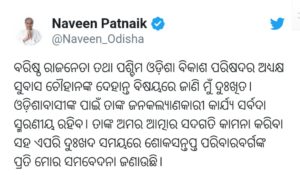 ମୁଖ୍ୟମନ୍ତ୍ରୀଙ୍କ ସହ କେନ୍ଦ୍ରମନ୍ତ୍ରୀ ଧର୍ମେନ୍ଦ୍ର ପ୍ରଧାନ, ବିଜେପି ରାଷ୍ଟ୍ରୀୟ ଉପାଧକ୍ଷ ବୈଜୟନ୍ତ ପଣ୍ଡା , କେନ୍ଦ୍ରମନ୍ତ୍ରୀ ପ୍ରତାପ ଷଢ଼ଙ୍ଗୀ ଶୋକପ୍ରକାଶ କରିଛନ୍ତି ।