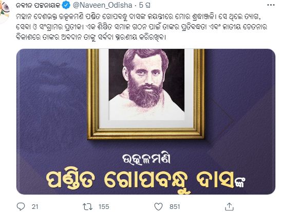 ପଣ୍ଡିତ ଗୋପବନ୍ଧୁ ଦାସଙ୍କ ଜୟନ୍ତୀରେ ଶ୍ରଦ୍ଧାଞ୍ଜଳି ଜଣାଇଲେ ମୁଖ୍ୟମନ୍ତ୍ରୀ