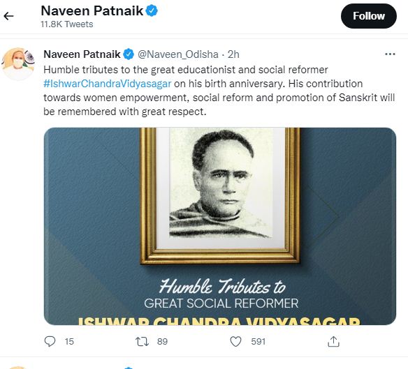 ଭୁବନେଶ୍ୱର: ମହାନ ଶିକ୍ଷାବିତ ଓ ସମାଜ ସଂସ୍କାରକ ଇଶ୍ୱର ଚନ୍ଦ୍ର ବିଦ୍ୟାସାଗରଙ୍କ ଆଜି ଜନ୍ମବାର୍ଷିକୀ । ତାଙ୍କୁ ଶ୍ରଦ୍ଧାଞ୍ଜଳି ଜଣାଇଛନ୍ତି ମୁଖ୍ୟମନ୍ତ୍ରୀ ନବୀନ ପଟ୍ଟନାୟକ । ନାରୀ ସଶକ୍ତିକରଣ, ସାମାଜିକ ସଂସ୍କାର ଓ ସଂସ୍କୃତର ପ୍ରସାର ଦିଗରେ ବିଦ୍ୟାସଗରଙ୍କ ଅବଦାନ ଚିର ସ୍ମରଣୀୟ ହୋଇ ରହିବ ବୋଲି ମୁଖ୍ୟମନ୍ତ୍ରୀ ତାଙ୍କ ବାର୍ତ୍ତାରେ କହିଛନ୍ତି ।