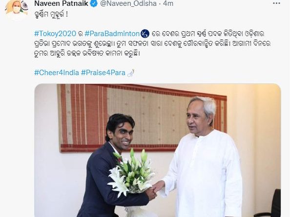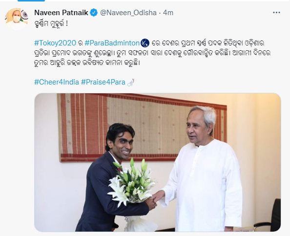 ଭୁବନେଶ୍ୱର: ଟୋକିଓ ପାରାଲିମ୍ପିକ୍ସରେ ସ୍ୱର୍ଣ୍ଣ ପଦକ ଜିତିଥିବା ଓଡ଼ିଆ ପୁଅଙ୍କୁ ଶୁଭେଚ୍ଛା ଜଣାଇଲେ ମୁଖ୍ୟମନ୍ତ୍ରୀ । ବ୍ୟାଡମିଣ୍ଟନରେ ବ୍ରିଟେନର ଖେଳାଳୀଙ୍କୁ ହରାଇ ସ୍ୱର୍ଣ୍ଣ ପଦକ ଜିତିଛନ୍ତି ପ୍ରମୋଦ ଭଗବତ । ମୁଖ୍ୟମନ୍ତ୍ରୀ ନିଜ ଟ୍ୱିଟର ହ୍ୟାଣ୍ଡେଲରେ ଶୁଭେଚ୍ଛା ଜଣାଇଛନ୍ତି ।