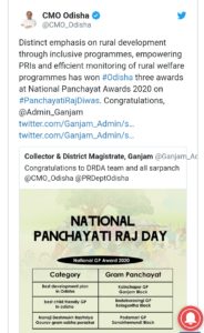 ଏନେଇ ମୁଖ୍ୟମନ୍ତ୍ରୀ ନିଜ ଟ୍ୱିଟରେ ଲେଖିଛନ୍ତି ଯେ, ଅନ୍ତର୍ଭୂକ୍ତ କାର୍ୟ୍ୟକ୍ରମ ମାଧ୍ୟମରେ ପଂଚାୟତୀରାଜକୁ ସଶକ୍ତିକରଣ ଏବଂ ଗ୍ରାମୀଣ କଲ୍ୟାଣ କାର୍ୟ୍ୟକ୍ରମର ଦକ୍ଷ ମନିଟରିଂ ମାଧ୍ୟମରେ ଗ୍ରାମାଞ୍ଚଳର ବିକାଶ ଉପରେ ସ୍ୱତନ୍ତ୍ର ଗୁରୁତ୍ୱ ଦିଆଯାଉଛି।