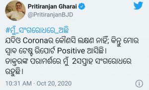 ସେ ଟ୍ୱିଟରେ ଲେଖିଛନ୍ତି ଯେ, ‘କରୋନାର କୌଣସି ଲକ୍ଷଣ ନଥିଲେ ବି ଯେହେତୁ ସ୍ୱାବ ଟେଷ୍ଟ ପଜିଟିଭି ଆସିଛି । ଡାକ୍ତରଙ୍କ ପରାମର୍ଶକ୍ରମେ ମୁଁ ୨ ଦୁଇ ସପ୍ତାହ ପାଇଁ ସଙ୍ଗରୋଧରେ ରହୁଛିି ।