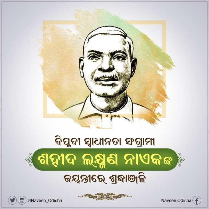 ଭୁବନେଶ୍ୱର: ଭାରତର ସ୍ୱାଧିନତା ସଂଗ୍ରାମୀ ତଥା ବୀର ବିପ୍ଲବୀ ଶହୀଦ ଲକ୍ଷ୍ମଣ ନାଏକଙ୍କ ଆଜି ହେଉଛି ଜୟନ୍ତୀ । ଏହି ଅବସରରେ ଶ୍ରଦ୍ଧାଞ୍ଜଳି ଜଣାଇଛନ୍ତି ମୁଖ୍ୟମନ୍ତ୍ରୀ ନବୀନ ପଟ୍ଟନାୟକ । ସେ ନିଜର ସୋସିଆଲ ମିଡିଆ ସାଇଟ୍ ଟ୍ୱିଟରରେ ଲେଖିଛନ୍ତି କି, ବିପ୍ଳବୀ ସ୍ୱାଧୀନତା ସଂଗ୍ରାମୀ ଶହୀଦ ଲକ୍ଷ୍ମଣ ନାଏକଙ୍କ ଜୟନ୍ତୀରେ ମୋର ଶ୍ରଦ୍ଧାଞ୍ଜଳି। ତାଙ୍କ ବିରତ୍ୱ ଓ ବଳିଦାନ ଦେଶପ୍ରେମର ଅନନ୍ୟ ଉଦାହରଣ। ଆଦିବାସୀ ଭାଇଭଉଣୀଙ୍କ ସ୍ୱାର୍ଥ ସୁରକ୍ଷା ପାଇଁ ତାଙ୍କର ସଂଗ୍ରାମ ସର୍ବଦା ସ୍ମରଣୀୟ ହୋଇ ରହିଛି।