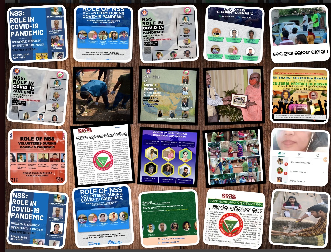 ଏନ୍ଏସ୍ଏସ୍ ସ୍ୱେଚ୍ଛାସେବୀମାନେ ଏପ୍ରିଲ୍ ୩ୟ ସପ୍ତାହରେ ୪ ଦିନ ଧରି ବିଶ୍ୱବିଦ୍ୟାଳୟ ପରିସର ନିକଟବର୍ତୀ ୧୦ ଟି ବସ୍ତିରେ ଶୁଖିଲା ଖାଦ୍ୟ ଓ ମାସ୍କ ବିତରଣ କରିଥିଲେ । ଏହାଛଡା ସୋସିଆଲ୍ ଡିଷ୍ଟାନ୍ସିଂ ସଚେତନତା ନିମନ୍ତେ ଜାତୀୟ ସ୍ତରରେ ଅନୁଷ୍ଠିତ ବିଭିନ୍ନ କାର୍ଯ୍ୟକ୍ରମରେ ସେମାନେ ଯୋଗ ଦେଇଥିଲେ । ଆନ୍ତର୍ଜାତିକ ଯୋଗ ଦିବସ କାର୍ଯ୍ୟକ୍ରମ (ଜୁନ୍ ୨୧)ରେ ୨୫୦ରୁ ଊଦ୍ଧ୍ୱର୍ ସ୍ୱେଚ୍ଛାସେବୀ ଅଂଶ ଗ୍ରହଣ କରିଥିଲେ । ଏହାଛଡା ଅଗଷ୍ଟ ୨୯ରେ “ଉନ୍ନତ ଭାରତ ଅଭିଯାନ” ଉପରେ ଏକ ୱେବିନାର୍ ଅନୁଷ୍ଠିତ ହୋଇଥିଲା । ଏଥିରେ ସୋଆ କୁଳପତି ପ୍ରଫେସର ଅଶୋକ କୁମାର ମହାପାତ୍ର, ରାଉରକେଲା ସ୍ଥିତ ଏନ୍ଆଇଟି ର ପ୍ରଫେସର ମହାବୀର ପଣ୍ଡା ଏବଂ ଡଃ ବିଭୁ କଲ୍ୟାଣ ପ୍ରସାଦ ନାୟକ, ସୋଆ ଛାତ୍ରମଙ୍ଗଳ ଡିନ୍ ପ୍ରଫେସର ଜ୍ୟୋତି ରଞ୍ଜନ ଦାସ, ଡଃ ନଚିକେତା ଶର୍ମା ଏବଂ ଡଃ କେ.ଏଲ୍. ମହାନ୍ତ ଯୋଗ ଦେଇଥିଲେ ।