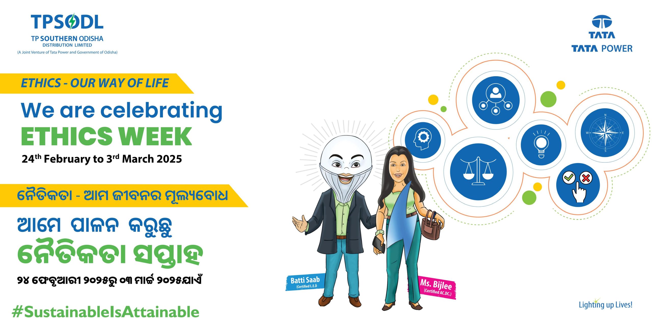 ବ୍ରହ୍ମପୁର: ଟାଟା ପାୱାର ଓ ଓଡ଼ିଶା ସରକାରଙ୍କ ଏକ ଯୌଥ ଉଦ୍ୟୋଗ ଟିପି ସଦର୍ଣ୍ଣ ଓଡ଼ିଶା ଡିଷ୍ଟ୍ରିବ୍ୟୁସନ୍ ଲିମିଟେଡ ପକ୍ଷରୁ ନୈତିକତା ସପ୍ତାହ ୨୦୨୫ ପାଳିତ ହୋଇଛି। ମାର୍ଚ୍ଚ ୩ ରେ ଶେଷ ହେବାକୁ ଥିବା ଏହି ସପ୍ତାହବ୍ୟାପୀ କାର୍ଯ୍ୟକ୍ରମରେ ଟାଟା ଗ୍ରୁପର ପ୍ରତିଷ୍ଠାତା ଶ୍ରୀ ଜାମସେଦଜୀ ନୁସରୱାନଜୀ ଟାଟାଙ୍କ ଜୟନ୍ତୀ ପାଳନ କରାଯାଉଛି।