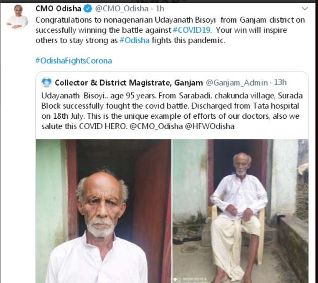 କରୋନାକୁ ହରାଇଲେ ୯୫ ବର୍ଷ ବୟସ୍କ ବୃଦ୍ଧ, ମୁଖ୍ୟମନ୍ତ୍ରୀଙ୍କ ଶୁଭେଚ୍ଛା