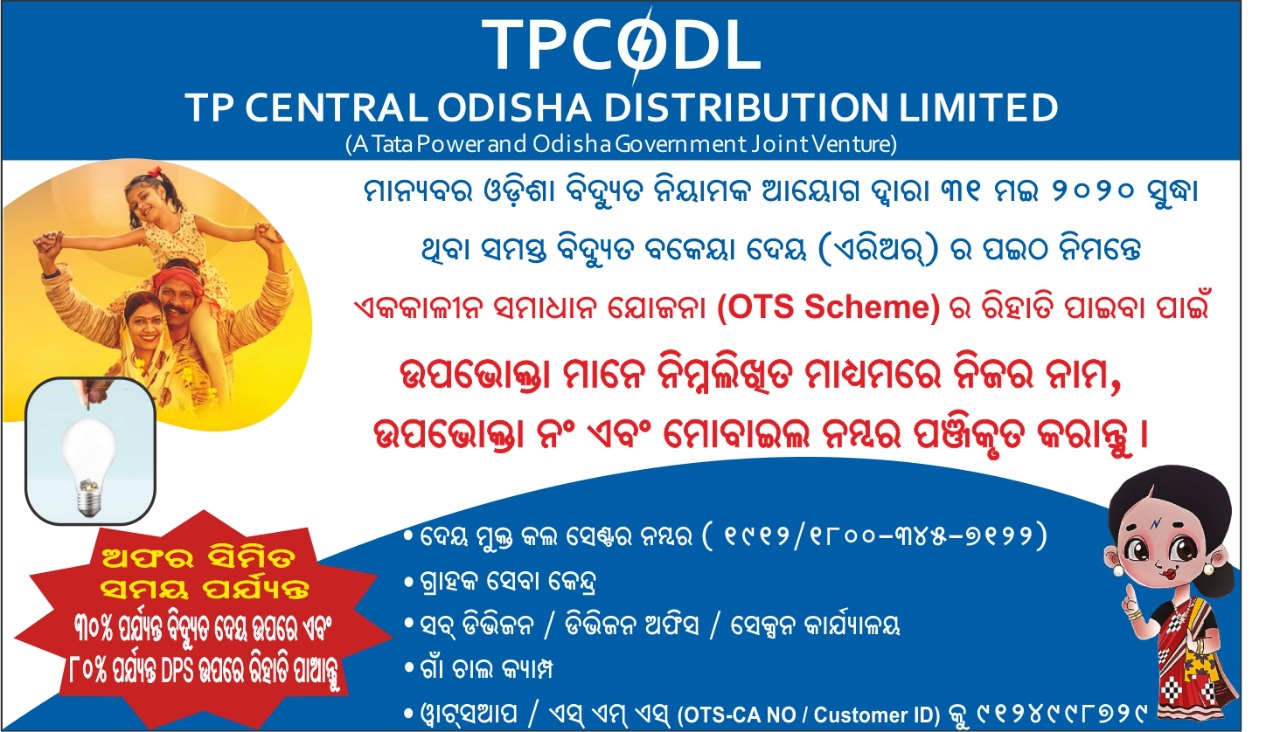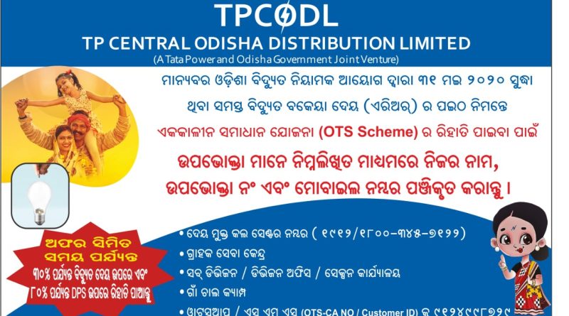 ଭୁବନେଶ୍ୱର: ଅତୀତର ବକେୟା ବିଲ୍ ପେମେଂଟ୍ ଉପରେ ଗ୍ରାହକମାନଙ୍କୁ ଆଶ୍ୱସ୍ତି ପ୍ରଦାନ କରିବା ଲାଗି ମାନ୍ୟବର ଓଡ଼ିଶା ବିଦ୍ୟୁତ୍ ନିୟାମକ ଆୟୋଗ (ଓଇଆର୍ସି)ଙ୍କ ଅନୁମୋଦିତ ଏକକାଳୀନ ସମାଧାନ ସ୍କିମ୍ (ଓଟିଏସ୍)କୁ ଟିପି ସେଂଟ୍ରାଲ ଓଡ଼ିଶା ଡିଷ୍ଟ୍ରିବ୍ୟୁସନ୍ ଲିମିଟେଡ୍ (ଟିପିସିଓଡିଏଲ୍) ପକ୍ଷରୁ କାର୍ଯ୍ୟକାରୀ କରାଯାଇଛି । ଏହି ସ୍ୱତନ୍ତ୍ର ସ୍କିମ୍ରେ ୨୦୨୦ ମେ’ ୩୧ ପର୍ଯ୍ୟନ୍ତ ଥିବା ବିଦ୍ୟୁତ୍ ବକେୟା ଉପରେ ୩୦% ପର୍ଯ୍ୟନ୍ତ ରିହାତି ପ୍ରଦାନ କରାଯିବ ।